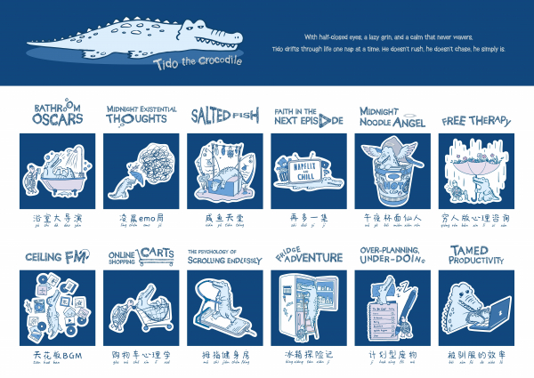 Reptiles were chosen as the main inspiration because they mirror the emotional and behavioral patterns of modern society. Being cold-blooded animals, they rely on external warmth to survive, much like employees who wear poker faces to work each day, appearing emotionless and detached in a system that drains their energy. Reptiles spend much of their time basking under the sun or in stillness, embodying the laziness and calm that define The Art of Not Trying Too Hard. Alongside Tido, his two pals, a lizard and a turtl