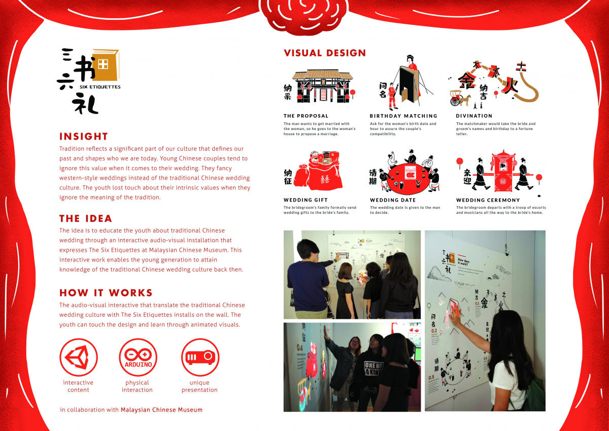 Six Etiquettes is an audio-visual interactive installation that translate the traditional Chinese wedding culture on the wall. The aim is to educate the youth about traditional Chinese wedding through an interactive poster with projected animation that expresses The Six Etiquettes at Malaysian Chinese Museum. This interactive work enables the young generation to attain knowledge of the traditional Chinese wedding culture back then. The youth can touch the design and learn through animated visuals.