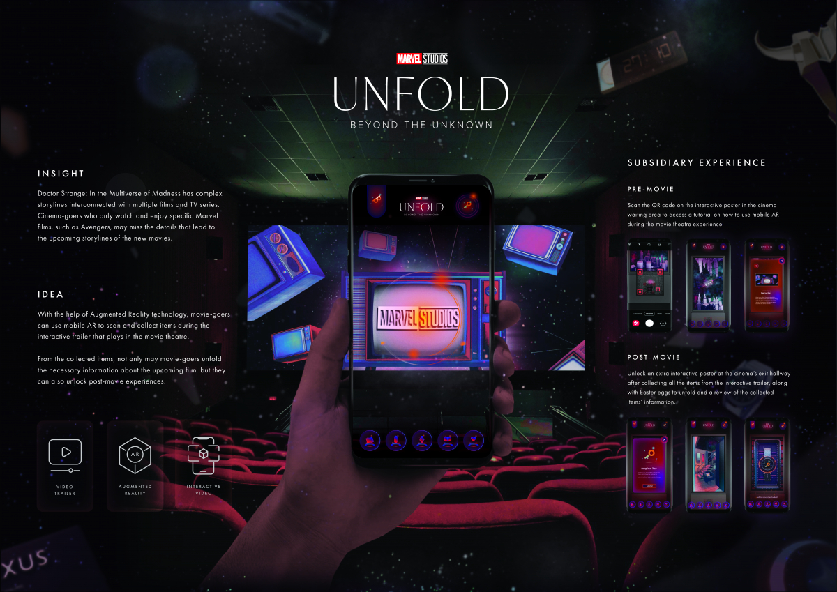 Unfold helps movie-goers understand movies with complex storylines with the use of mobile AR. They are able to scan and collect items during the interactive trailer that plays in the movie theatre.