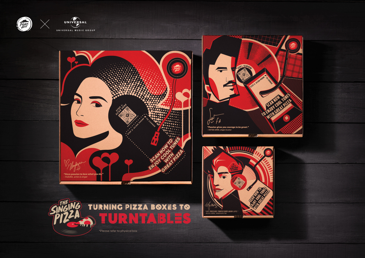 We turned pizza boxes into digital turntables thanks to a collaboration with Universal Music. We called it ‘The Singing Pizza’, and it allowed millennials to enjoy great pizza and cool tunes anytime, anywhere! In our first phase, each box harmoniously combined different genres of music and design elements of Pizza Hut’s pizza. In our second phase, we recreated the faces of Universal Music artists with Pizza Hut’s colours. Even our app was designed to match the vinyl design seen on each box as the vinyl spun music, to create one seamless experience. All they had to do is scan the code, and press play. The more pizzas you ordered, the more songs and goodies you unlocked. Not surprisingly, these boxes became collectibles.