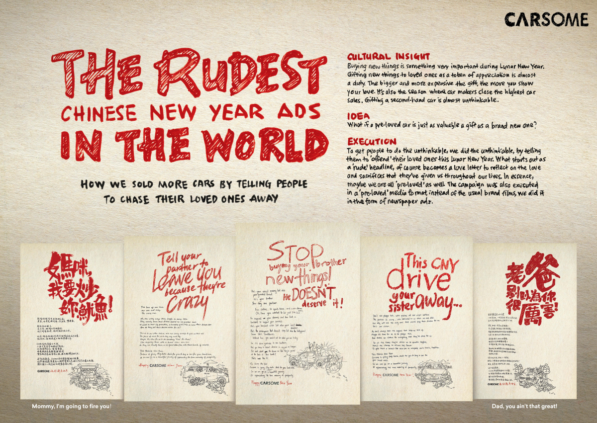 We had to sell the idea that a pre-loved car is just as valuable of a gift as a brand-new one. So, to capture the attention of our audience we made love letters for our closest loved ones. The catch? all our letters started with a huge rude headline. All the love letters start off as harsh callouts but as you progress it becomes a love letter to reflect on the love and sacrifices they’ve given us throughout our lives. In essence, maybe we are all ‘pre-loved” as well. The campaign was also executed in a preloved” media format, instead of the usual brand films, we did it in the form of newspaper ads.