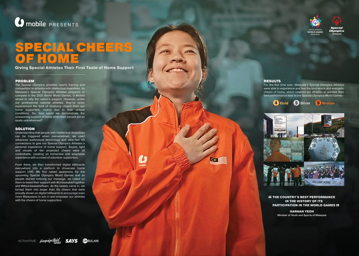 The Special Olympics provides sports training and competition to athletes with intellectual disabilities. As Malaysia’s Special Olympics Athletes prepared to compete in the 2023 Berlin World Games, U Mobile aimed to rally the nation’s support. However, unlike our professional national athletes, they’ve rarely experienced the thrill of receiving cheers from our home supporters, mainly due to their unique conditions. So, how could we demonstrate the unwavering support of home when their senses are so easily overwhelmed?